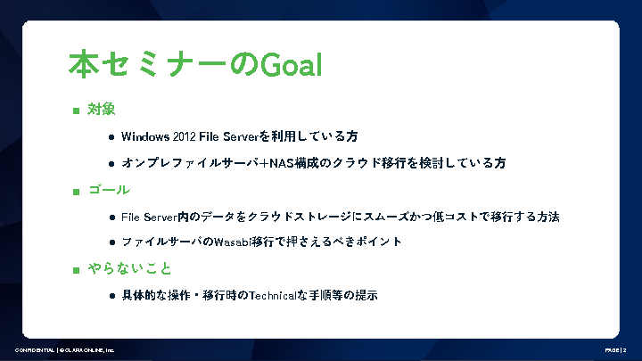 このセミナーでは、オンプレサーバからクラウドストレージへの移行の進め方、押さえるべきポイントをご紹介します。