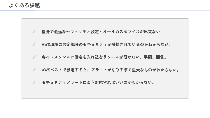 ガートナー社は「2025年までにクラウドセキュリティ障害の99%は顧客側の設定不備によるもの」と予測しており、今後、AWSを安全に利用するためには適切な設定と運用が不可欠となってきます。