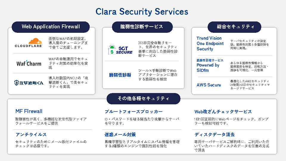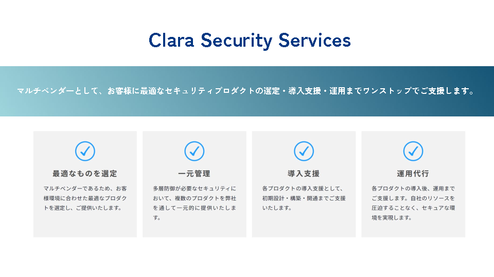 マルチベンダーとして顧客環境に合わせた最適なプロダクトの選定から導入支援・運用までをワンストップで柔軟に支援してきたクララが、自社の課題に合った最適なセキュリティサービスの選び方を7つのポイントに沿って分かりやすく解説いたします。