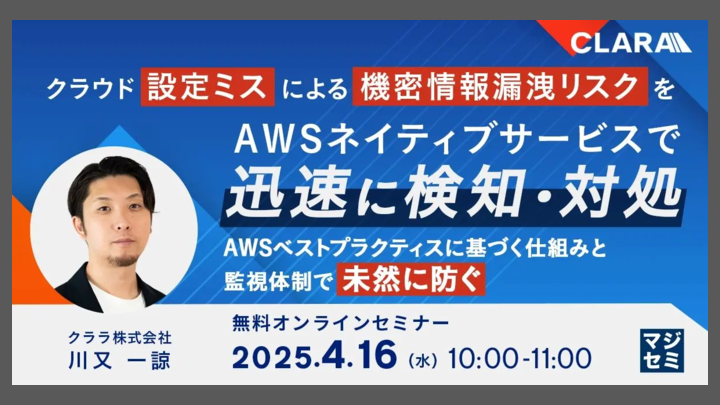 10:05~10:45 クラウド設定ミスによる機密情報漏洩リスクをAWSネイティブサービスで迅速に検知・対処 ~AWSベストプラクティスに基づく仕組みと監視体制で未然に防ぐ~