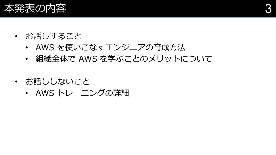 マネージャーの方であれば「AWSを活用する組織の作り方」「AWS人材の育成方法」について、メンバーの方であれば「AWSスキル習得の進め方」を持ち帰れるセミナーとなっております。