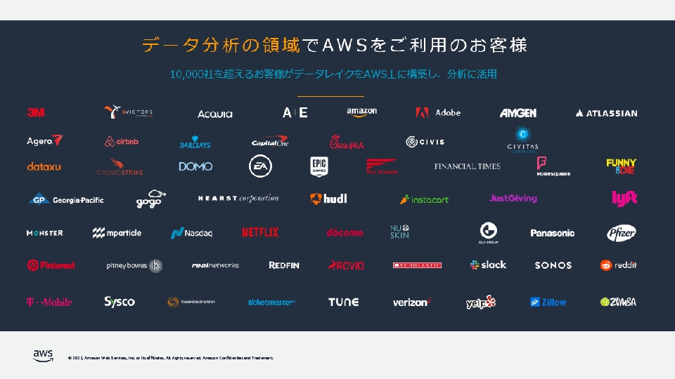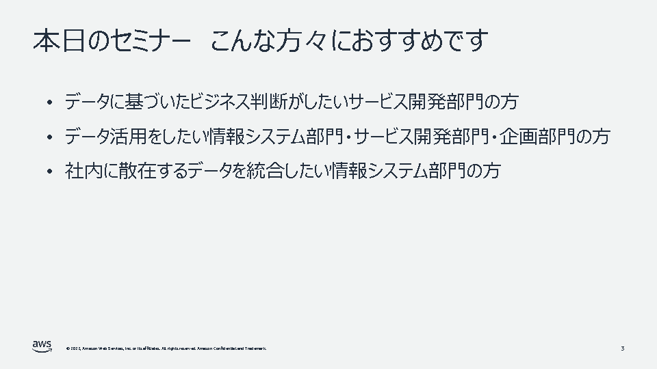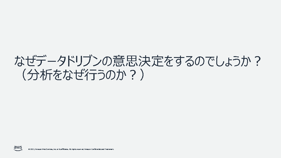 そこで本セミナーでは、データ分析にまつわる様々な課題を解決するための具体的なプロセスや、解決を支援するAWS上のサービスを解説します。