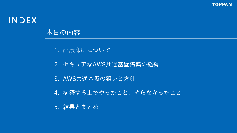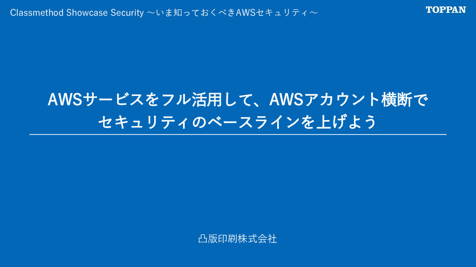 本セミナーでは、AWS ControlTower、SecurityHubを含む各種Organization統合サービスを活用してアカウント横断でセキュリティのベースラインを上げる環境を構築した、凸版印刷株式会社様の事例を紹介いたします。