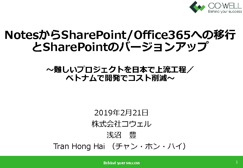 そこで本セミナーでは、日本側で要件整理、基本設計などの上流工程を担当し、ベトナムオフショア側で開発・テスト工程を行うことで、最適なコストでSharePpointの導入、バージョンアップ、マイグレーションを実施する方法を紹介します。また独自のアセスメントツールや移行ツールを活用することで、安全かつ低コストでお客様のSharepointへのマイグレーションを実現する方法を紹介します。