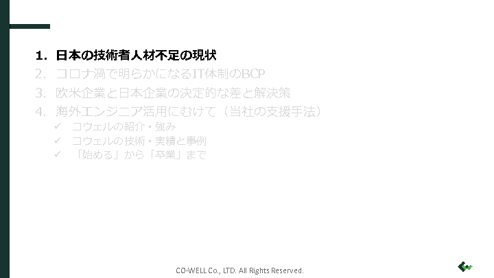 また、ベトナムオフショア開発会社でありながら、大企業のシステム開発を数多く、日本品質で手がける株式会社コウェルが、「ラボ型開発」、「日本での社員雇用」、「現地開発子会社設立」などの失敗しやすいポイントについても詳しく解説いたします。技術力、開発プロセスで大手ユーザー企業の中~大規模ウェブシステム開発や、スマートフォンアプリ開発、AWSインテグレーション、などの開発事業を展開する株式会社コウェルが事例を交えて海外を視野に入れた開発体制の強化手法を紹介します。