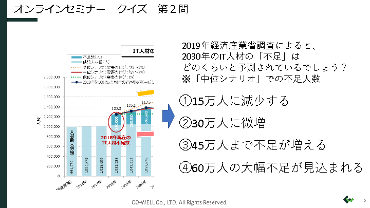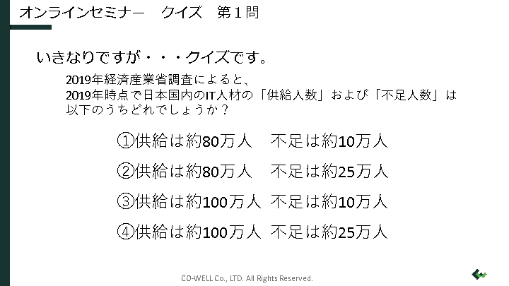 現在IT求人倍率は10倍を超え、2025年の崖・2030年69万人のIT人材不足といった「慢性的IT人材不足」の現状です。