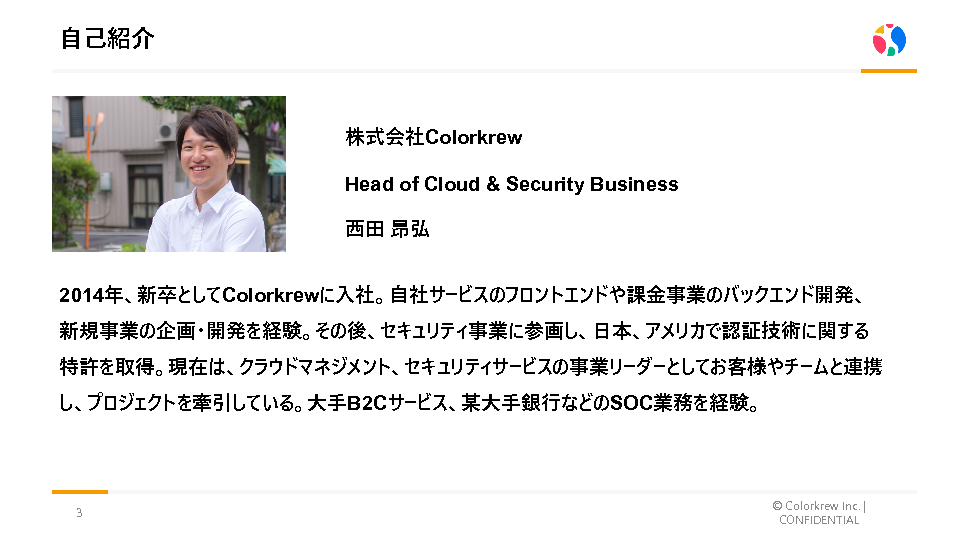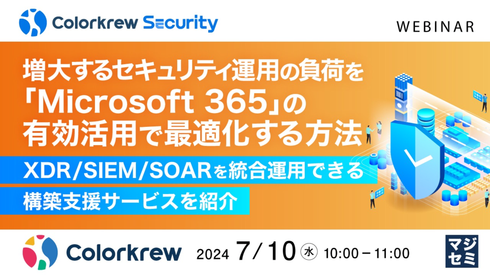 さらに、2023年に日本マイクロソフトの「Secure multicloud environment Award」を受賞したColorkrewが提供する「Microsoft 365セキュリティ支援」サービスを紹介。独自の脅威検知機能や柔軟なアラートのカスタマイズなどに加え、Microsoft 365ライセンスで使用可能なセキュリティ・サービスの導入支援、その後の監視運用まで総合的に支援するソリューションについて、その概要や導入効果などをご説明します。「セキュリティベンダーや製品を統合したい」「セキュリティ運用のコストを抑えたい」という方は、ぜひご参加ください。
