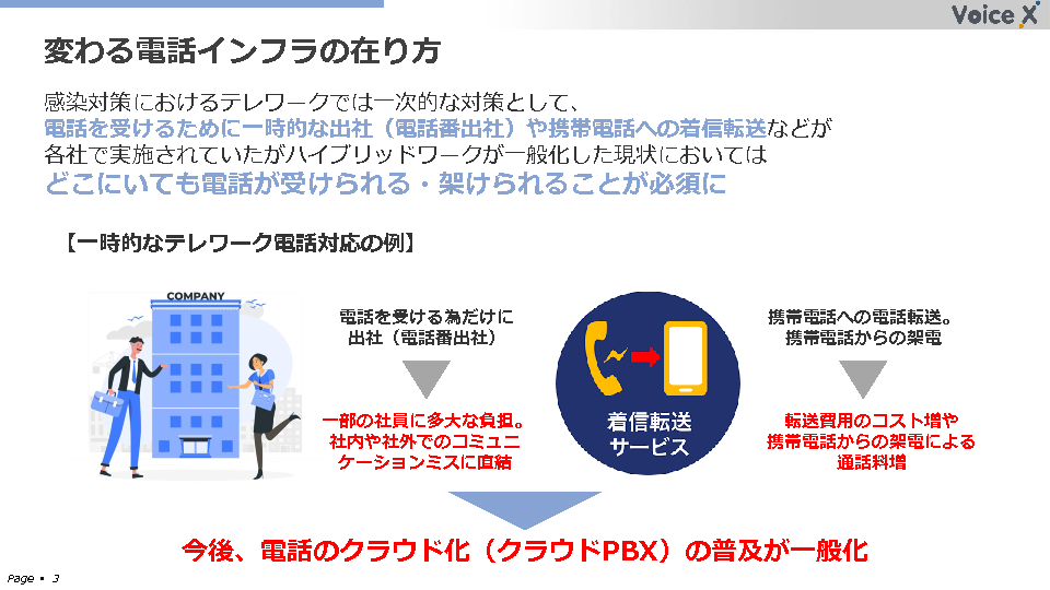 また、上記の実現手法として、電話業務のテレワーク化を実現する次世代型クラウドPBX「Voice X(ボイスクロス)」についてもご紹介する予定です。