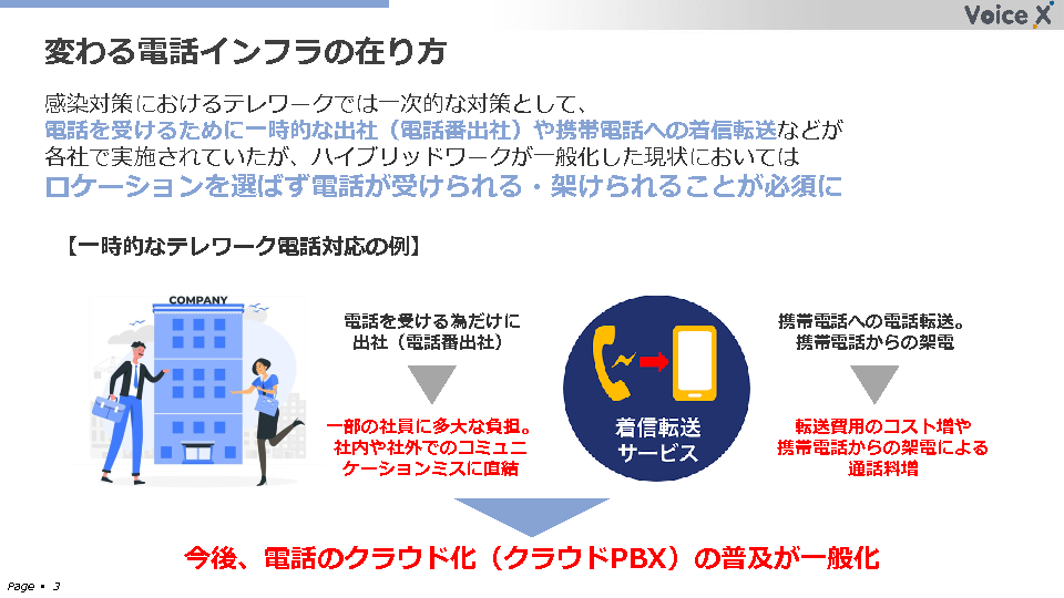クラウド技術の発達とテレワークやオフィスのフリーアドレス化などの浸透を背景に、企業の新たな電話の仕組みとして、クラウドPBXが普及し始めるようになりました。