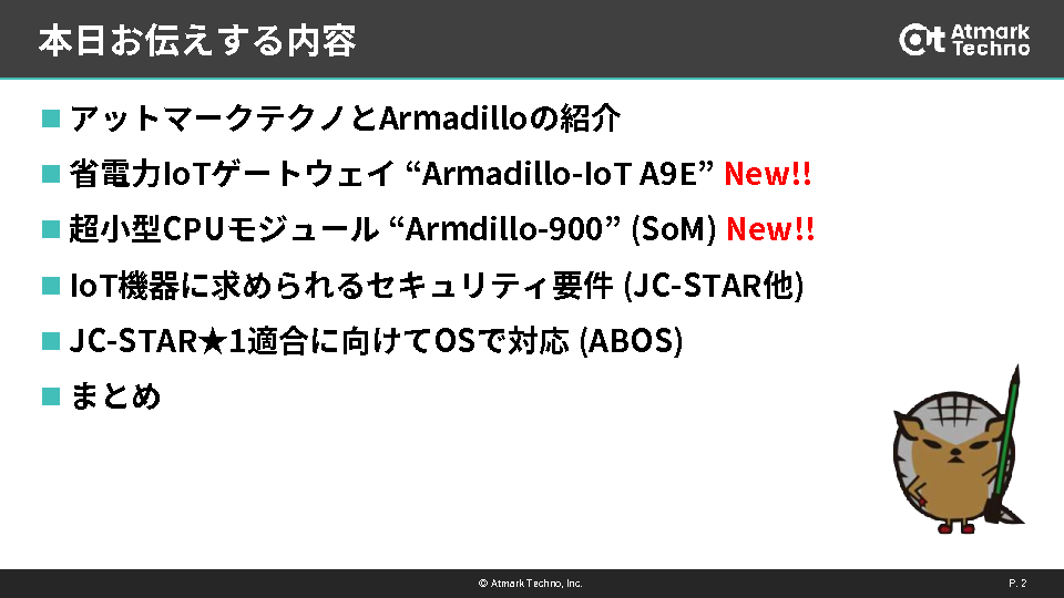 本セミナーでは、最先端の省電力性能と通信機能を備えた最新モデル「Armadillo-IoTゲートウェイA9E」と、超小型で省電力な実装型CPUモジュール「Armadillo-900」、Armadilloを活用したシステム開発と運用のメリットを紹介します。