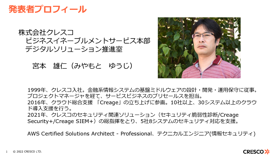 システムエンジニアとして株式会社クレスコに入社。金融系情報システムの基盤ミドルウェアの設計・開発・運用保守に従事。プロジェクトマネージャを経て、サービスビジネスのプリセールスを担当。2021年より、クレスコのセキュリティ関連ソリューションを担当。