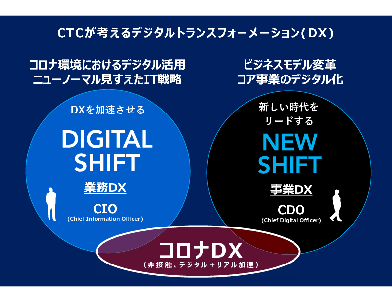 コロナ禍の現在、アフターコロナそしてその先を見据えた形で既存の企業情報システムをアップデートしていくのと同時に、さらに新たな形で事業をデジタル化していく必要があります。そのような状況下におけるCTCのDXの取組とその事例をご紹介します。