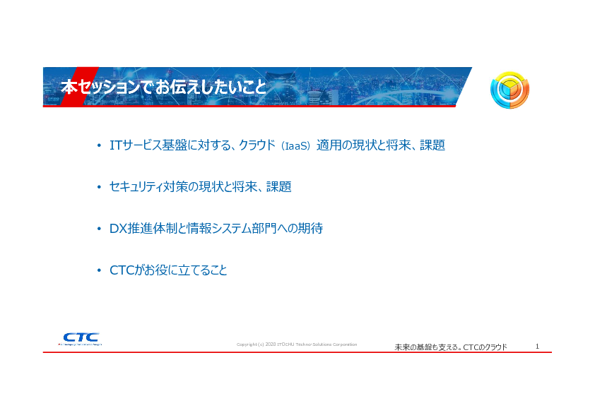 本セミナーでは、「ニューノーマル時代のIT基盤とDX」をテーマに、CTCで実施した情シス向けIT基盤(クラウド)調査の結果、米国の最新DX事情、CTCの社内DX事例をご紹介。クラウドとDXのトレンドを押さえ、情シス責任者、経営部門がこれから取るべきアクションを解説します。