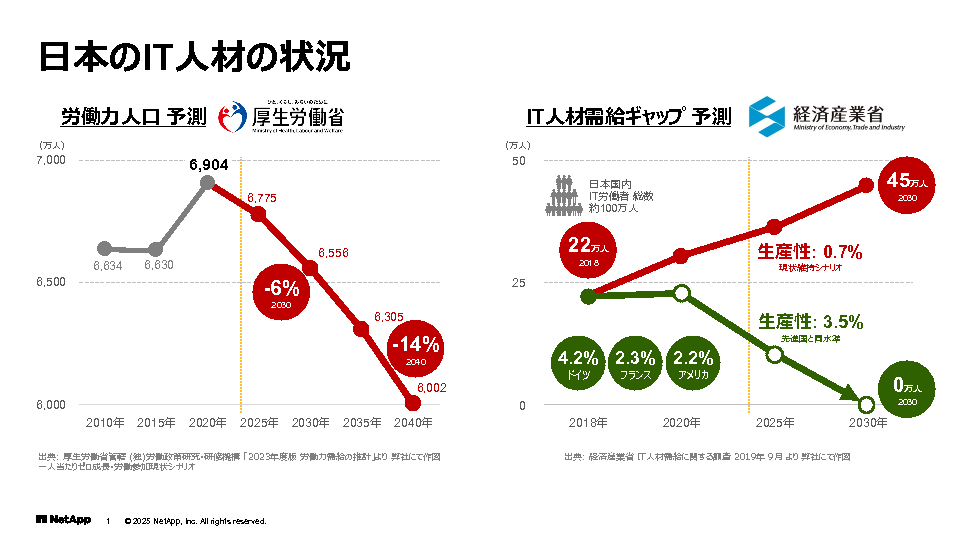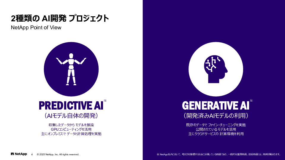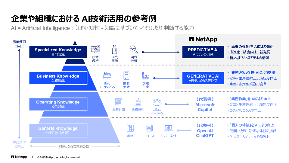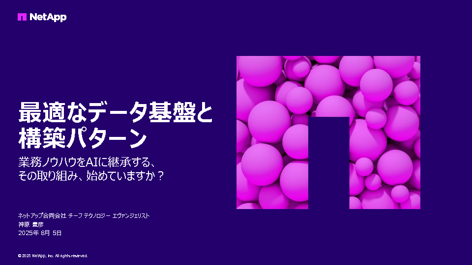 本セミナーでは、現場ノウハウをAIに継承するために不可欠な「データ基盤の整備」と「インフラの標準化・最適化」について、NetAppのAIソリューション及びCTCの支援内容をご紹介します。分散したデータをセキュアかつ効率的に統合・可視化し、AIモデル開発に耐える柔軟なアーキテクチャをどのように構築すべきか。拡張性の高いAIインフラ設計のベストプラクティスや、実際の導入事例を交えながら、AI活用を現場レベルから推進するための「仕組みづくり」を解説します。