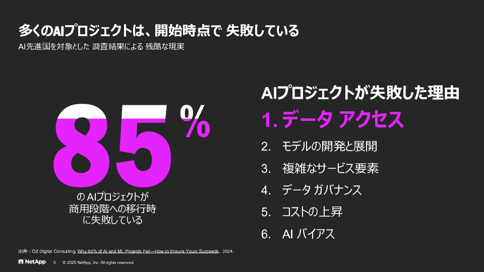 現場で培われたノウハウは、様々なシステムや様々な設備の中に、分散して保管されており、その形式もまた多様です。これにより、AI開発に必要なデータの収集・加工に多大な時間と労力がかかり、モデル開発や実装のスピードが大幅に低下しています。さらに、データ基盤やITインフラが属人的に構築・運用されているケースも多く、プロジェクトごとに環境がバラバラでスケーラビリティが確保できないという課題も浮き彫りになっています。こうした状況では、全社レベルで成果を出すことが困難となっています。