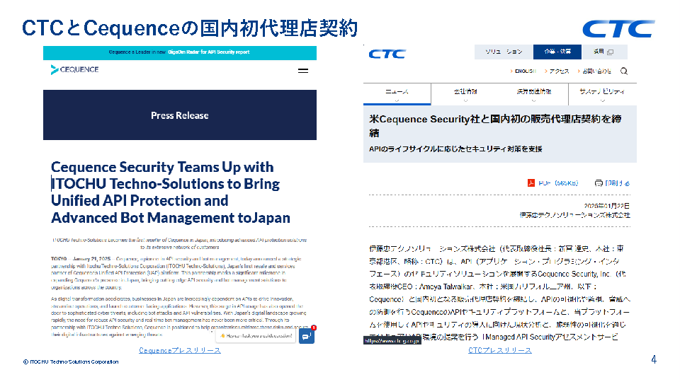 APIの利用拡大に伴い、攻撃手法も高度化・自動化しています。本セミナーでは、従来のWAFでは防ぎきれないAPI特有の脅威に対して、AIを活用した最新のセキュリティ対策を紹介します。機械学習を用いたリアルタイム防御、異常検知によるゼロデイ攻撃対策など、APIセキュリティに特化したソリューション「Cequence Security」を用いて、APIのリスクを可視化し、効率的に保護するためのアプローチを解説し、企業が直面するAPIセキュリティの課題を解決するため策を提供します。