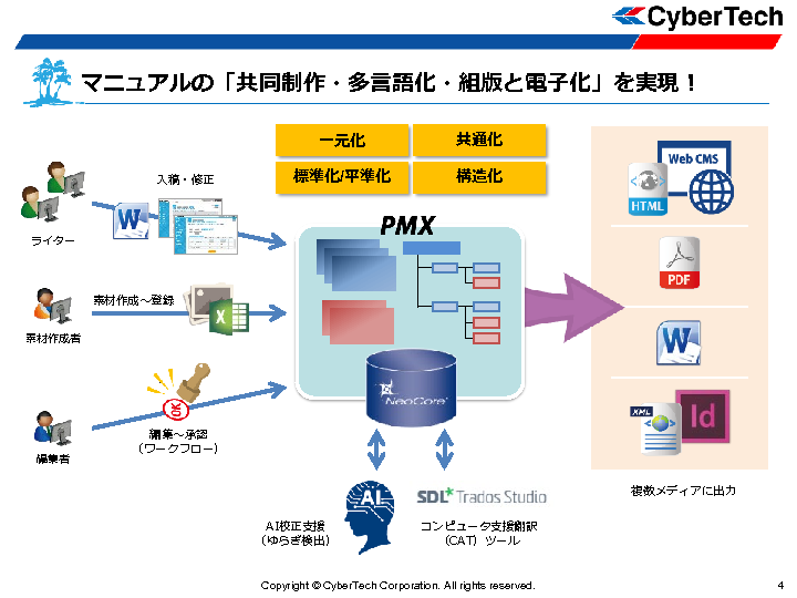 さらに、翻訳作業も、Tradosなどのコンピュータ支援翻訳(CAT)ツールやGoogle翻訳などの機械翻訳と連携することで、スピーディかつ低コストで多言語マニュアルの改訂運用が行えます。