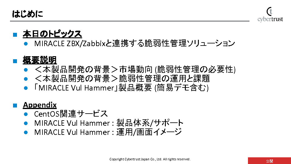 また、Zabbixと連携して脆弱性を管理するサービス「MIRACLE Vul Hammer」についてもご紹介します。