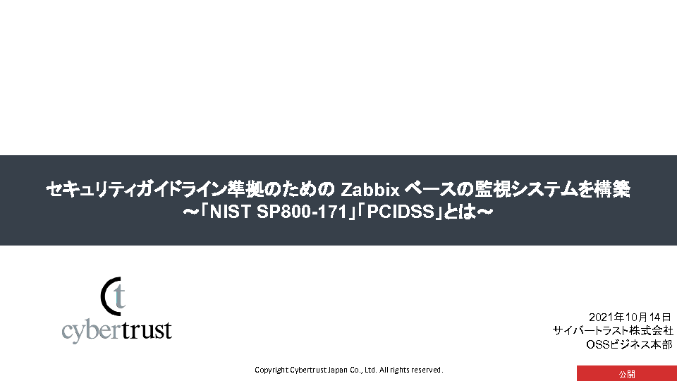 13:05~13:45 「NIST SP800-171」「PCI DSS」などセキュリティガイドライン準拠のZabbixベースの監視システムを構築したい~コストメリットを生かしつつ、商用ソフトにも負けないセキュリティを両立~