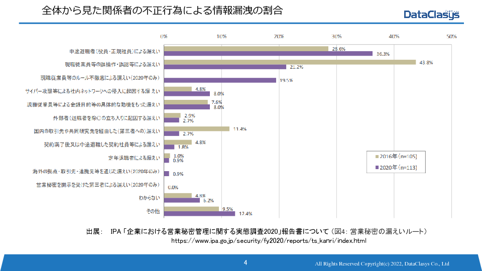 昨今様々なセキュリティリスクが存在し、その中でも”内部不正”はIPAが公開する「情報セキュリティ10大脅威2022」の5位にランクインしています。ネットワーク内部に脅威が潜む内部不正は、外部攻撃と比べ情報を抜き取られてしまうリスクも大きく、また企業の内情を知っているため確実に価値の高い情報を狙われてしまうという特徴もあります。特に昨今では「手土産転職」と呼ばれる元社員による持ち出しや、産業スパイによる漏洩も後を絶ちません。