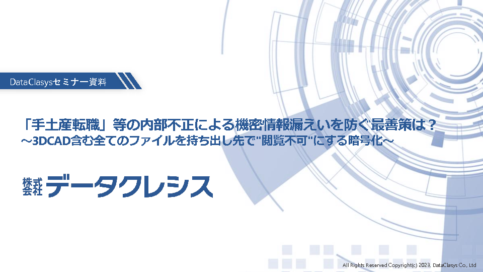 本セミナーでは、内部不正による情報漏えいへの対策として、”ファイル暗号化”と3DCADを含むすべてのファイルに対してそれを実現するIRMソリューション「DataClasys」について、事例を交えてご紹介します。