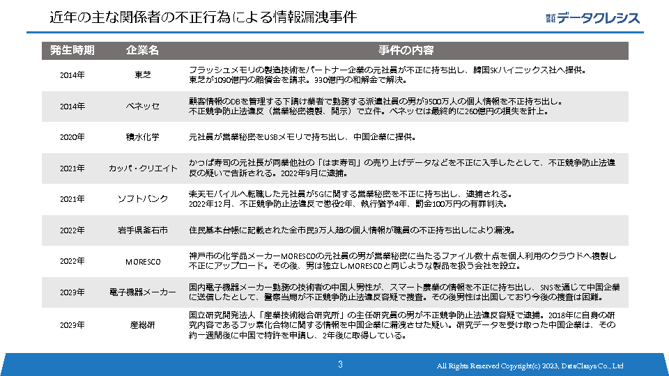 製造業における情報セキュリティリスクは多岐にわたり、企業はこれに対処する必要があります。近年、外部からの攻撃だけでなく、関係者による技術情報の不正持ち出しも注目を浴びており、2023年1月にIPAが公表した「情報セキュリティ10大脅威」では、内部不正による情報漏えい