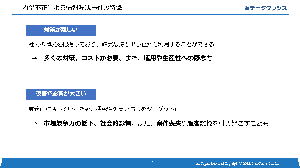 さらに、DataClasysは内部不正による漏えいだけでなく、海外子会社や委託先にデータを渡す際の漏えい対策(サプライチェーンリスクへの対策)やランサムウェアによる情報窃取への対策など広く漏えい対策として役立ちます。