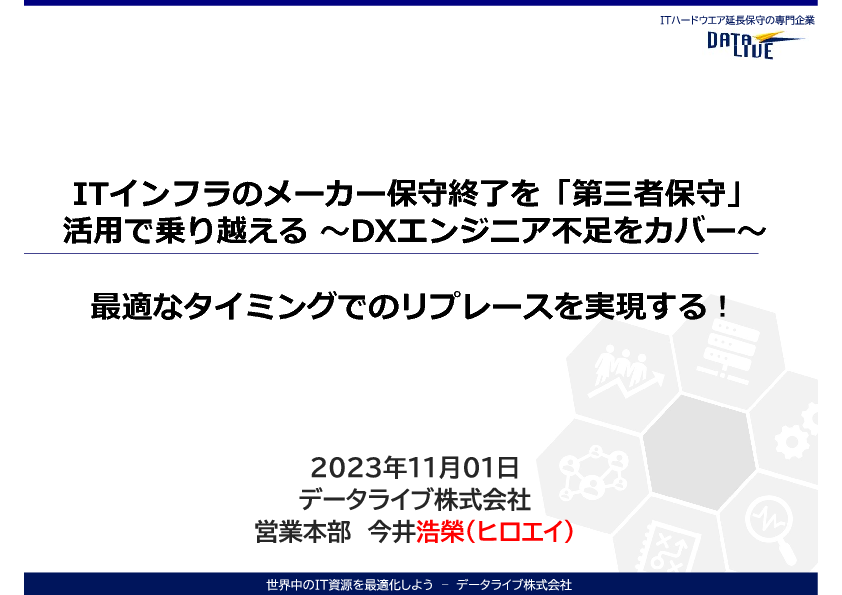 11:05~11:45 ITインフラのメーカー保守終了を「第三者保守」の活用で乗り越える ~DXエンジニア不足をカバーし、最適なタイミングでのリプレースを実現する~