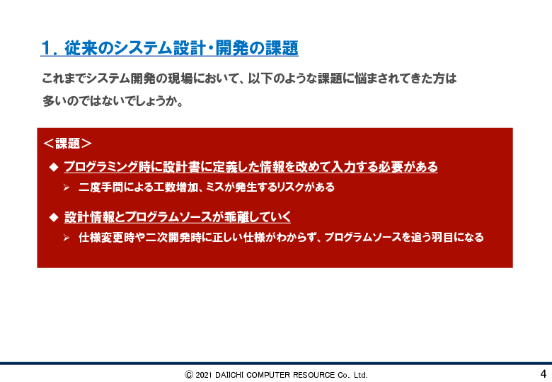 また、プログラミングでは設計書に定義した画面レイアウトや項目などを改めて入力する必要があり、こちらでは二度手間が発生します。
