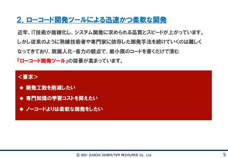 近年、IT技術が複雑化し、システム開発に求められる品質とスピードが上がっています。しかし従来のように熟練技術者や専門家に依存した開発手法は再現性が高くありません。脱属人化・省力の観点で、最小限のコードを書くだけで済むローコード開発は需要がますます高まっています。