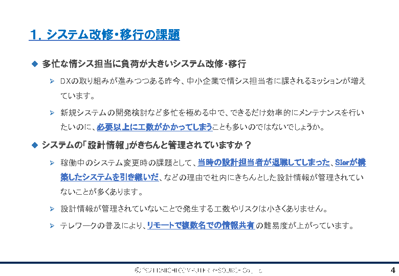 稼働中のシステム変更時の課題として、当時の設計担当者が退職してしまった、SIerが構築したシステムを引き継いだ、などの理由で社内にきちんとした設計情報が管理されていないことが多くあります。設計書や設計情報が管理されていないことで発生する工数やリスクは小さくありません。さらに、テレワークの普及により、リモートで複数名での情報共有の難易度が上がっています。