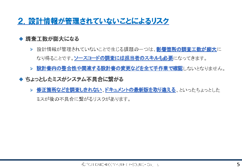 また、修正箇所などを調査しきれない、ドキュメントの最新版を取り違える、といったちょっとしたミスが後の不具合に繋がるリスクがあります。