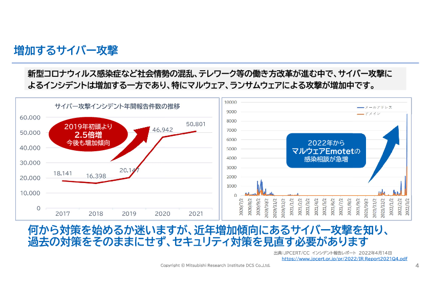 近年、マルウェアやランサムウェアなどの外部からのサイバー攻撃が急増しており、情報セキュリティに対する脅威が高まっています。