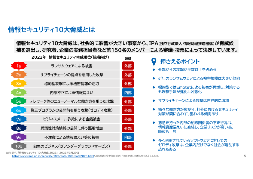 実際、2023年のIPAから発表された情報セキュリティ10大脅威においても、これらのサイバー攻撃が上位にランクされています。