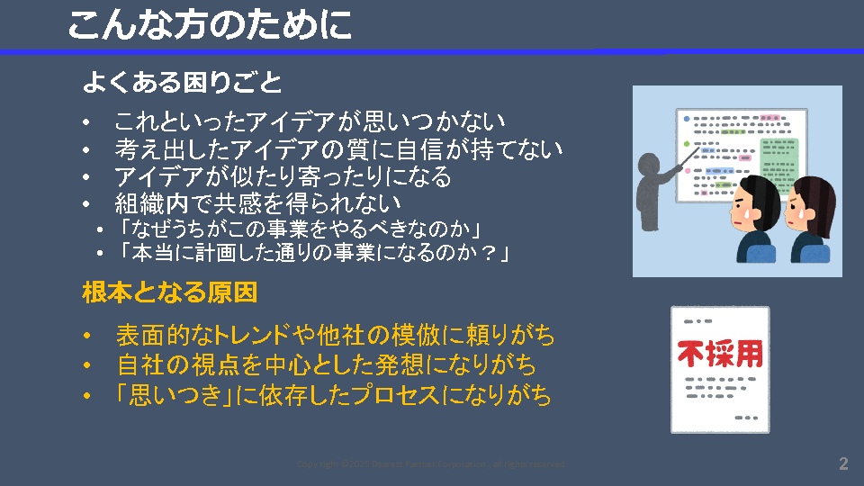 新規事業創出を行っていきたいがアイデア出しの手法がわからない・新規事業に取り組んでいるが思ったように進まないと感じている新規事業担当者様やリーダー、プロジェクトマネージャーの方に特におすすめの内容です。