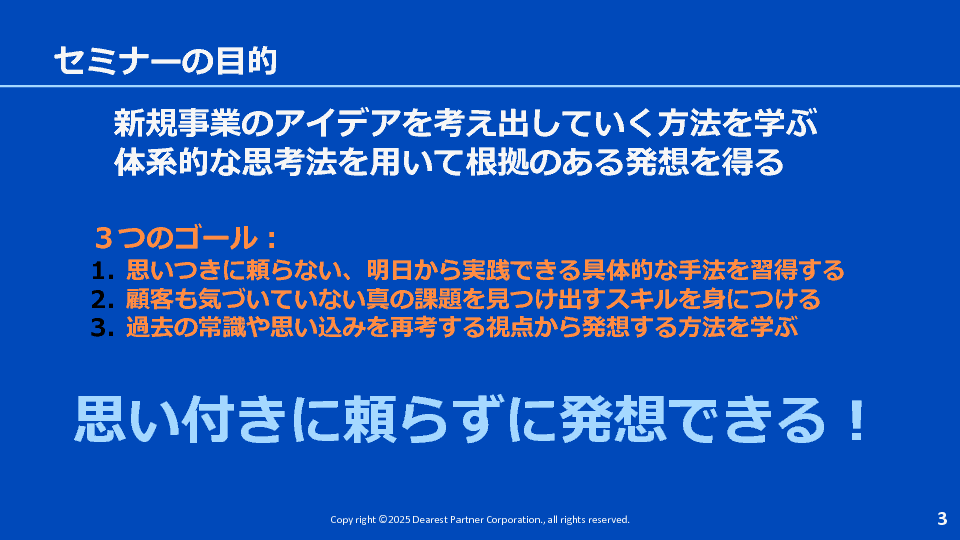 本セミナーでは、思い付きや思い込みといった不確実で根拠に欠けるアイデア創出に頼らず、体系的に実践できるアイデア発想法について解説いたします。