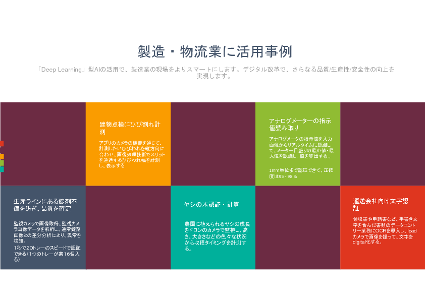 特に画像解析の分野では、単に人間の負担を減らし業務を効率化することはもちろん、人間ではできないような判別・判断や集計・分析、予測などを