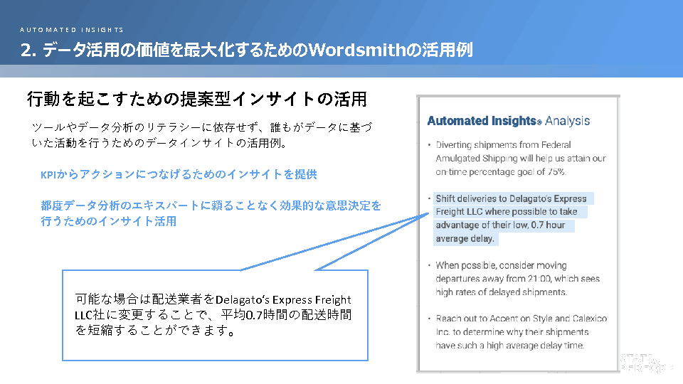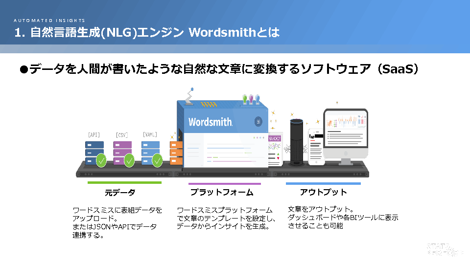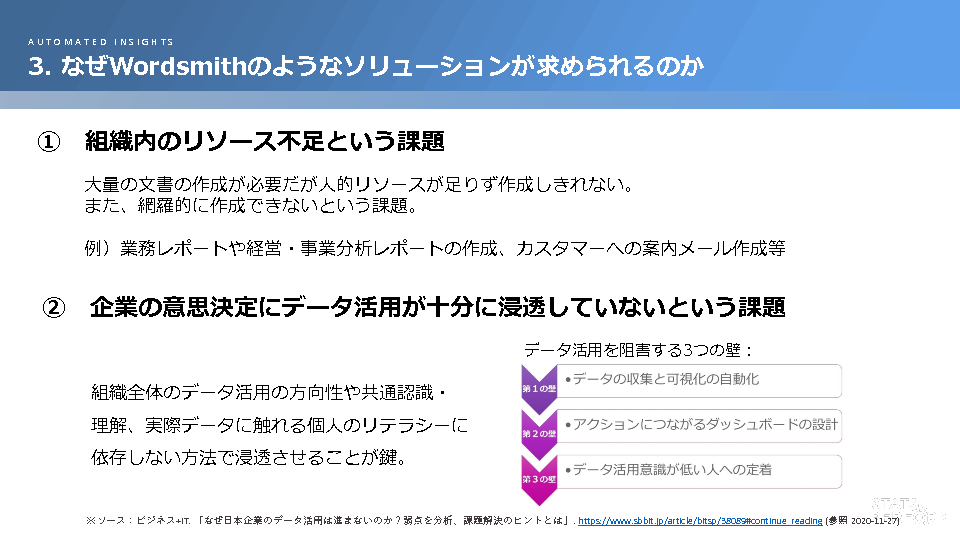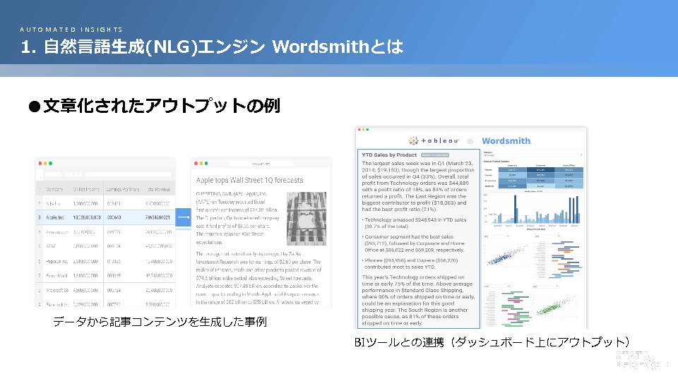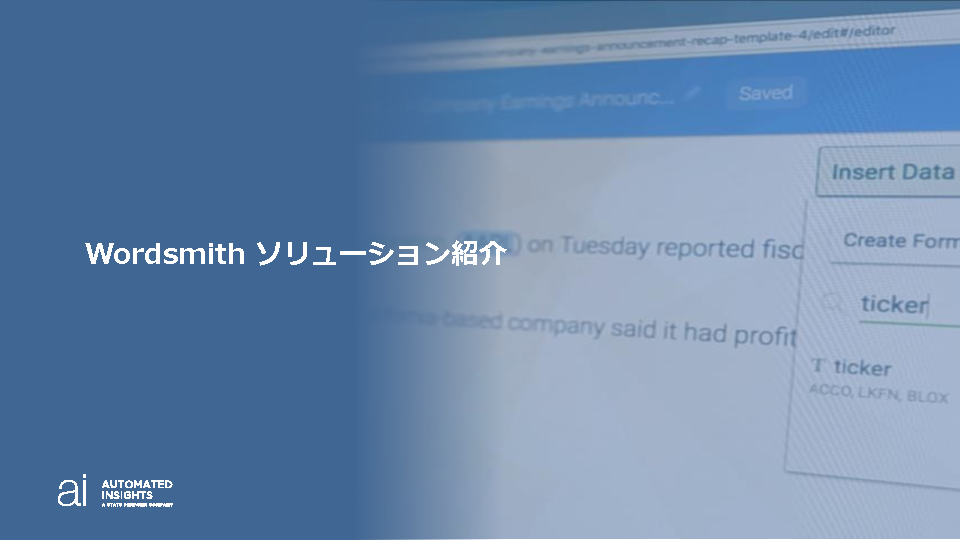 本セミナーでは、「RPAやAIを導入したがDXが加速しない」という課題に対して、年間150億以上の文章生成実績のある自然言語生成エンジン「Wordsmith(ワードスミス)」の活用をしたDX事例をご紹介します。NLG(自然言語生成)でデータを「言語化」し、要約や叙述を自動化するソリューションについて解説、デモも行います。