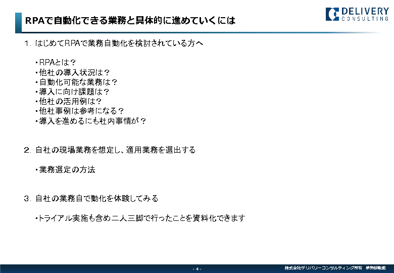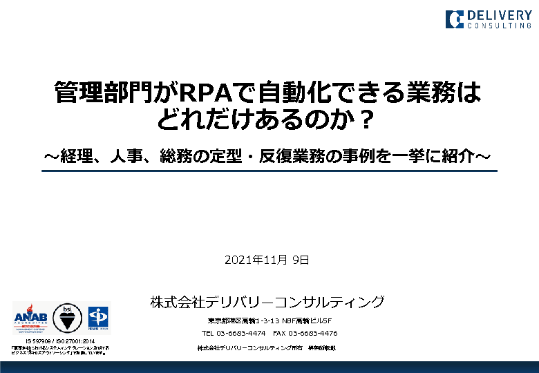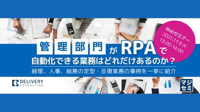 本セミナーは「管理部門がRPAで自動化できる業務はどれだけあるのか」をテーマに、管理部門の抱える業務課題と原因、管理部門が自ら使い込むためのRPAの選び方、経理・総務・人事における業務自動化の事例を一挙にご紹介します。デリバリーコンサルティングが提供するRPAツール「ipas」の製品デモも行います。「これからRPAの導入を検討される方」は奮ってご参加ください。