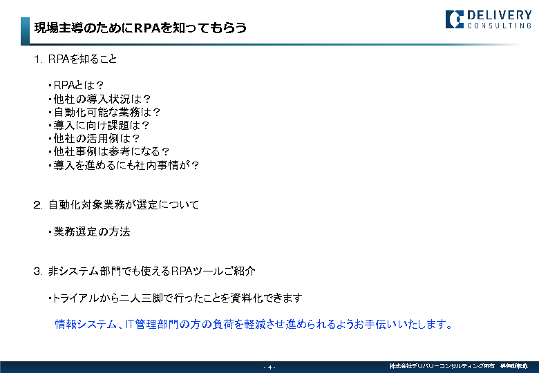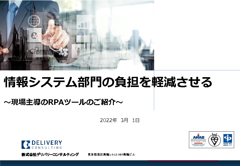 13:05~13:40 情報システム部門の負担を軽減させる、現場主導のRPAツールご紹介 〜知識不要でつかえるRPA導入で、部門と情シスをWin-Winに〜(デリバリーコンサルティング)