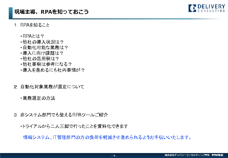 本セミナーは「RPA導入におけるシステム担当者の負荷を減らし、現場主導で行うRPA運用」をテーマに、RPAの基本情報、情シスの負荷軽減ができる現場主導型RPAの選び方、バックオフィスでの業務自動化の事例紹介、費用対効果の算出方法などを解説します。デリバリーコンサルティングが提供するシンプルなRPAツール「ipaSロボ」の製品デモも行います。