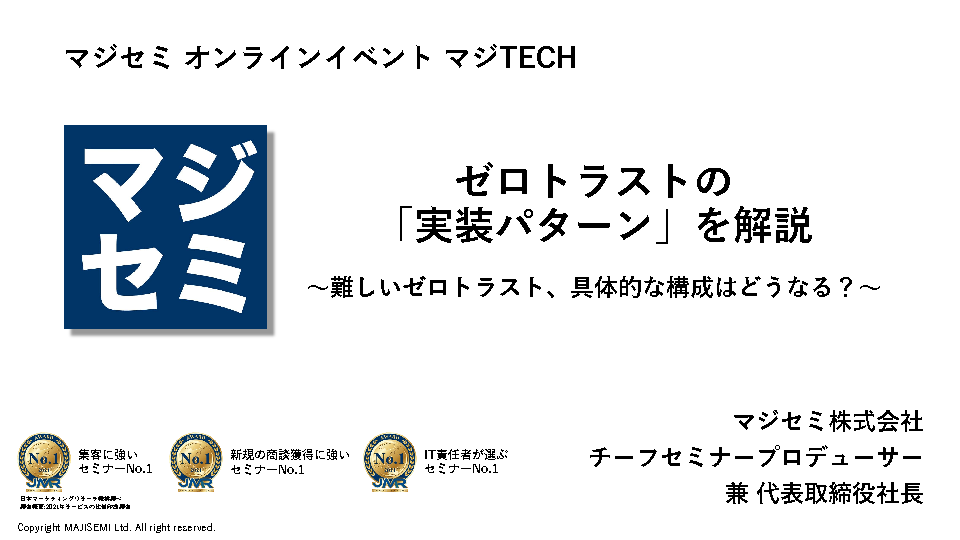そこで本セミナーでは、ゼロトラストの実現のためには、どのようなカテゴリの製品をどのように組み合わせる必要があるのか、ゼロトラストの「実装パターン」について、わかりやすく解説します。