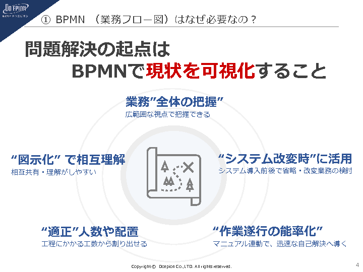 業務フロー図(BPMN)の活用により、業務の全体像を可視化。様々な問題解決の起点とすることができます。