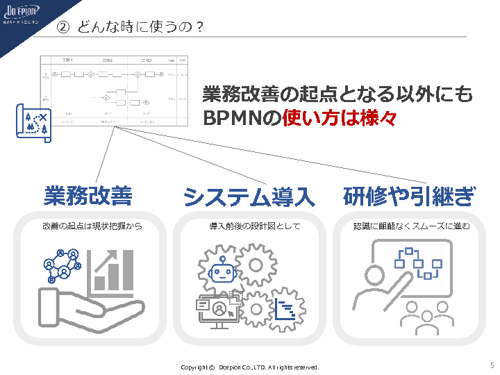 業務フローを誰が見てもわかりやすい形で表現できるため、業務改善だけではなく、研修や引継ぎ・システム導入の設計を行う際にも活用が可能です。