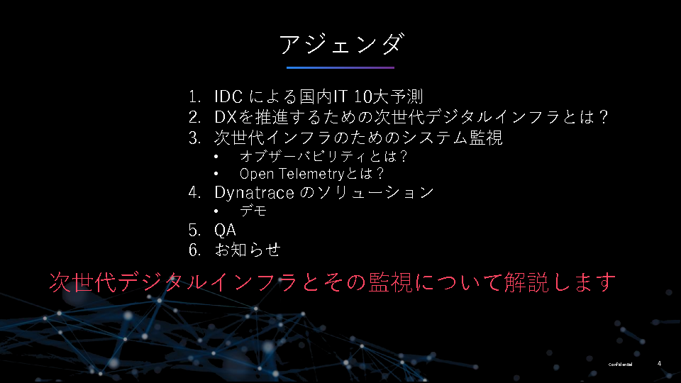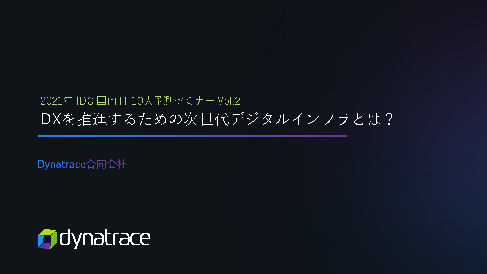 本セミナーではクラウドセントリック、CAPEXモデルからOPEX モデルへのシフト、エッジインフラ、データの高速処理、AIや機械学習を使ったインフラ管理などのテーマを中心にDynatraceが提供するソリューションと事例を交えてご紹介します。