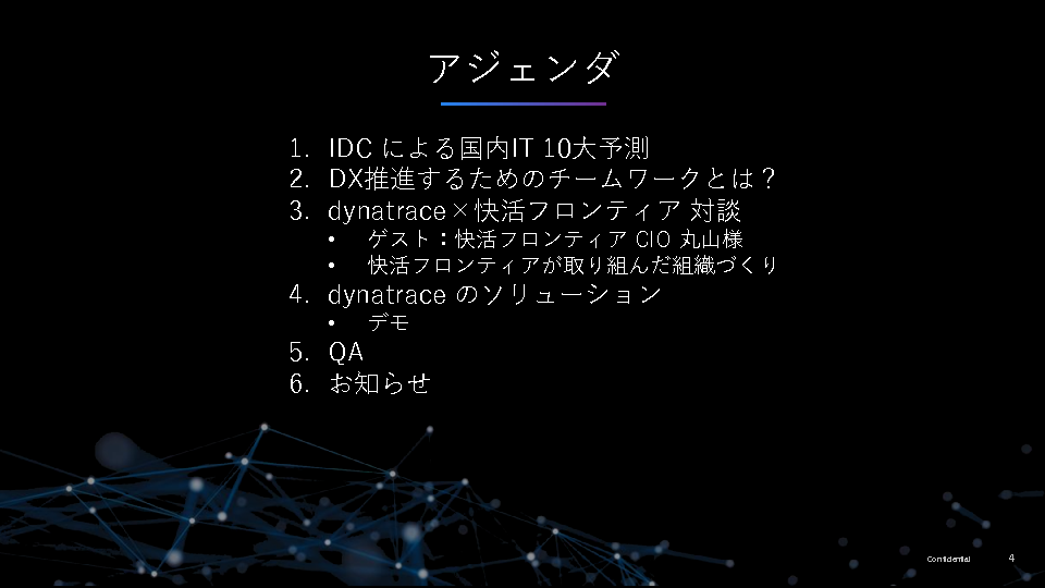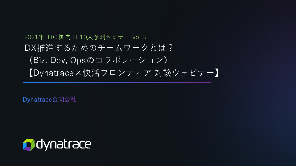 IDC10大予測シリーズ最終回となる本セミナーでは、DX時代にIT組織に求められる「チームワーク」をテーマに、組織やシステムを統合・連携してDXを推進している快活フロンティア様の事例のご紹介、およびDynatraceが提供するソリューションと事例のご紹介を行います。CIO、DX部門・情シス部門の責任者は奮ってご参加ください。