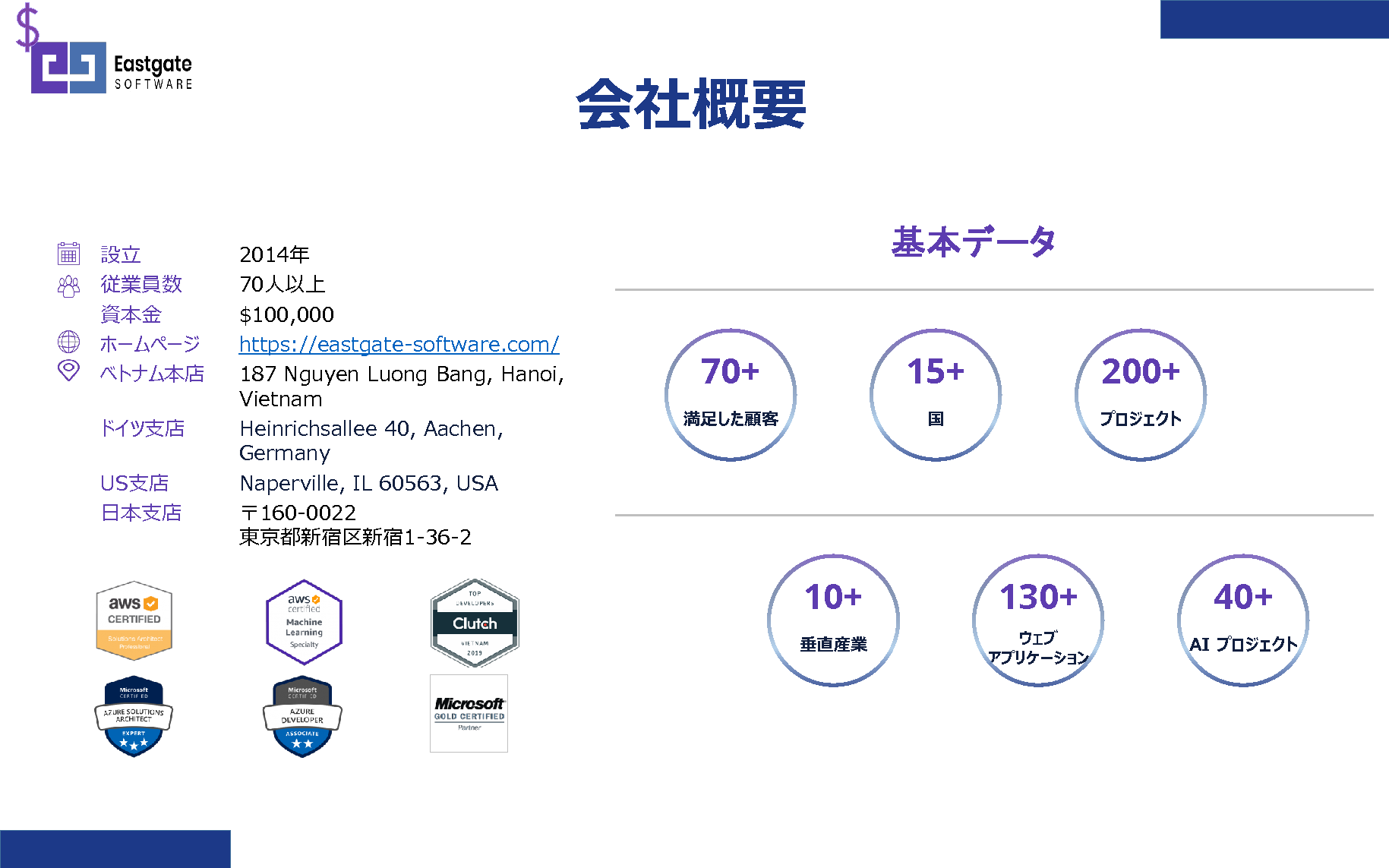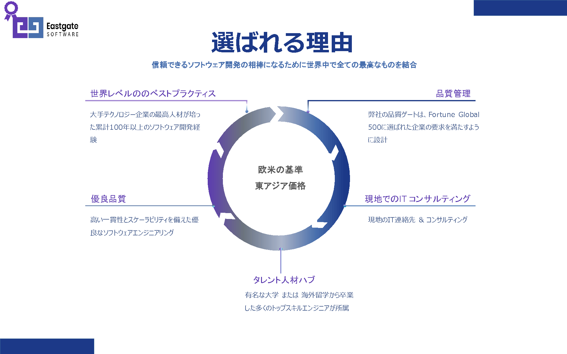 そこで本セミナーでは、フォーチュングローバル500に選ばれた企業の要求を満たすなど高い技術力をもち、有名大学や海外留学から卒業した多くのトップスキルエンジニアによって、高度に複雑化したレガシーシステムのクラウドネイティブ化を実現してきたソフトウェアアウトソーシング会社、イーストゲートソフトウェア(Eastgate Software JSC) 社のオフショア開発サービスを紹介します。