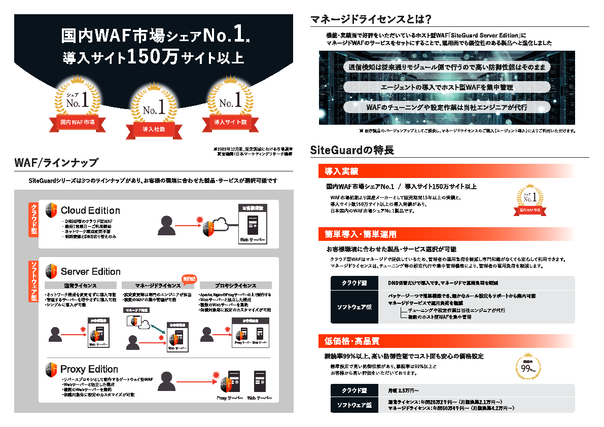 そこで本セミナーでは、実際の攻撃事例を交えながら、Webサイトの防御に特化したセキュリティ対策「WAF」の基本と必要性をわかりやすく解説します。さらに、クラウド型・オンプレ型・プロキシ型から選べる「SiteGuardシリーズ」を例に、お客様のシステム構成に応じた特性に応じたWAF選定のポイントや、導入・運用・コストのバランスに優れた構成について紹介します。
