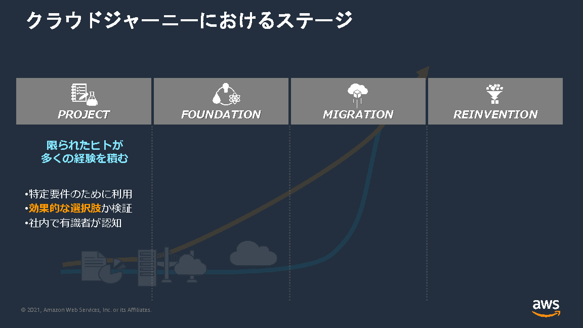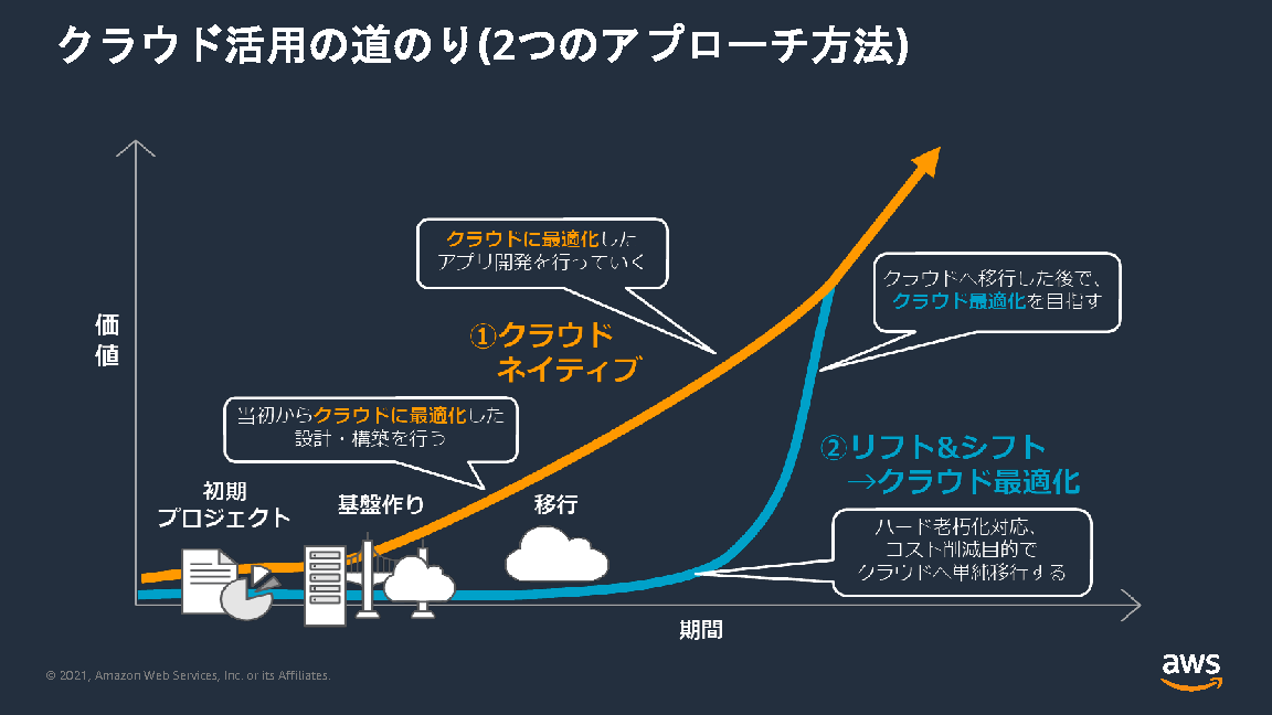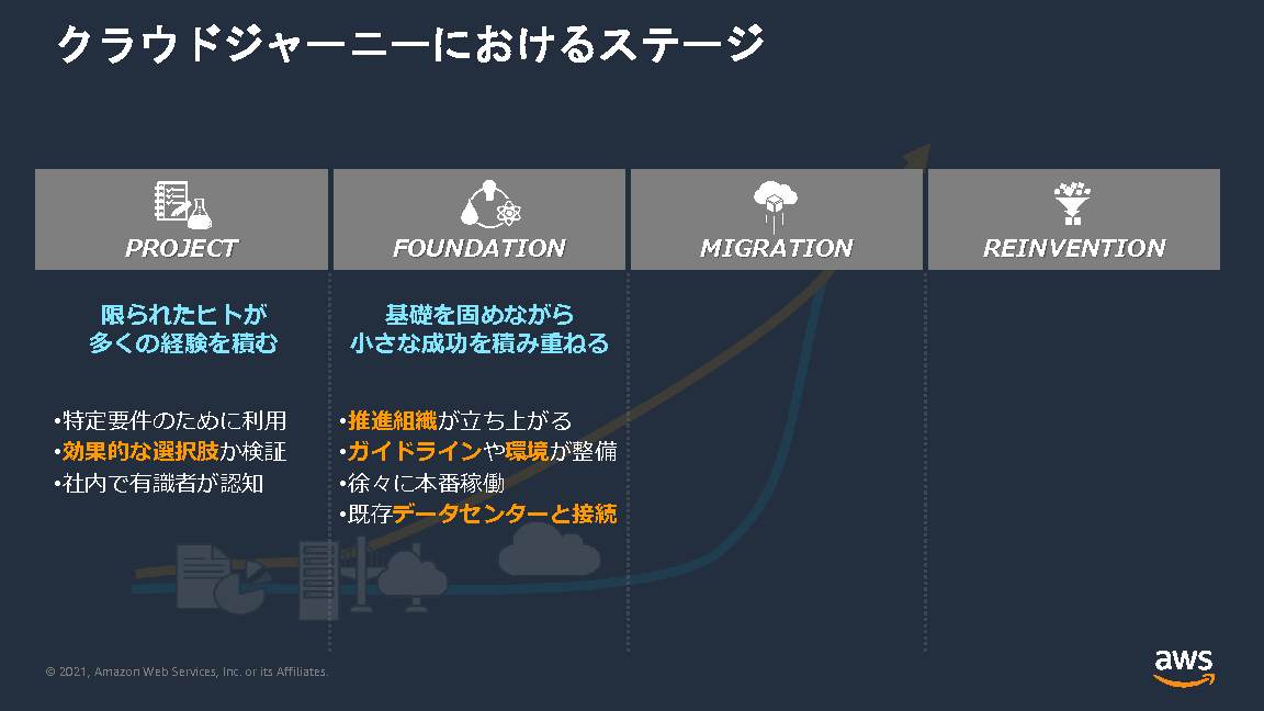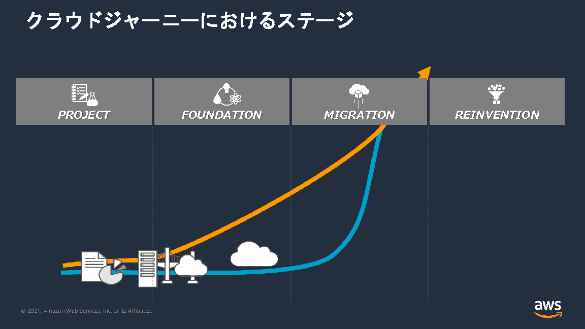 クラウド移行を成功させるには、自社のIT環境の状況に合った移行方法を選択することが重要です。このセッションでは、AWSが提唱する7つの移行方式とクラウドジャーニーにおいて各ステップで必要となAWS移行を支援するフレームワークサービスをご説明いたします。