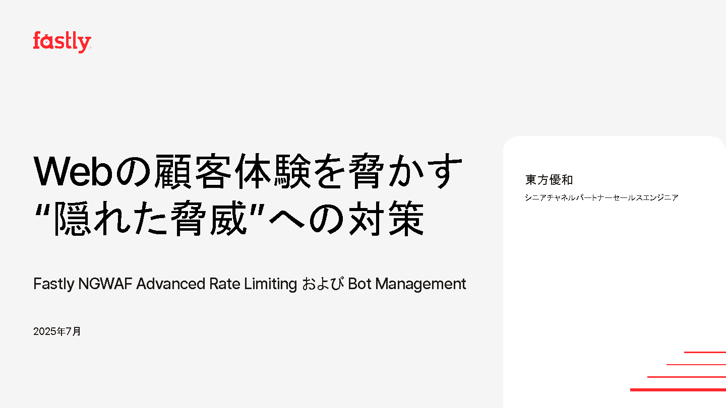 本セミナーでは、Fastlyが提供するCDN+WAFによる対策をベースに、従来型セキュリティでは捉えきれない攻撃の実態と、パフォーマンスまで考慮した防御戦略をご紹介します。巧妙化・自動化・高速化するBOTやトラフィックの影響を可視化し、CXと売上を守るために必要な視点を、最新の実例とともにお伝えします。“攻撃を防ぐ”だけでなく、“体験を壊さない”視点としてユーザ体験をどう保つかを解説します。